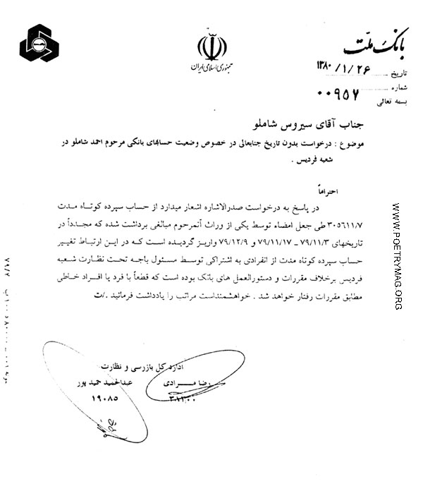 مجله‌ی شعر از سیروس شاملو سپاس‌گزار است که این مدرک را جهت نشر در اختیار ما گذاشته است.