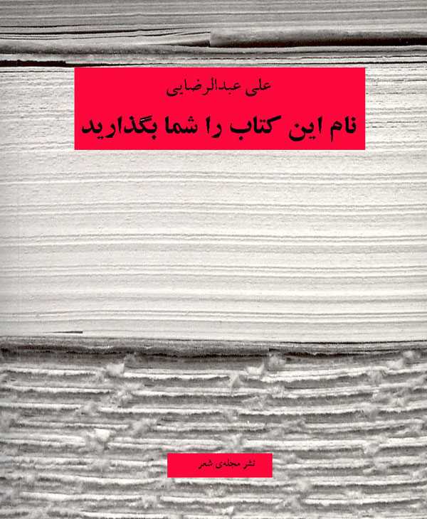 نام این کتاب را شما بگذارید علی عبدالرضایی ١۳٧۴ (PDF برای دریافت متنِ کاملِ این کتاب اینجا کلیک کنید (فرمت ( برای دریافت متنِ کاملِ این کتاب اینجا کلیک کنید ( فرمت فلش فهرست اشعار فاطی کماندو برادران پاسخ دنیا کافه میدان انقلاب جمعه هوش کسی مرا نمیداند هزار و یک شب عقرب کدخدا سیانور تیغ پیشآمد مجسمه کورتاژ ریزی قبول مردم شاعری من نیستم! ارتباطات گم شد و پیدا نشد علامت دست از سرم بردار! ایران انسان حرف اضافه درست تاج سگ